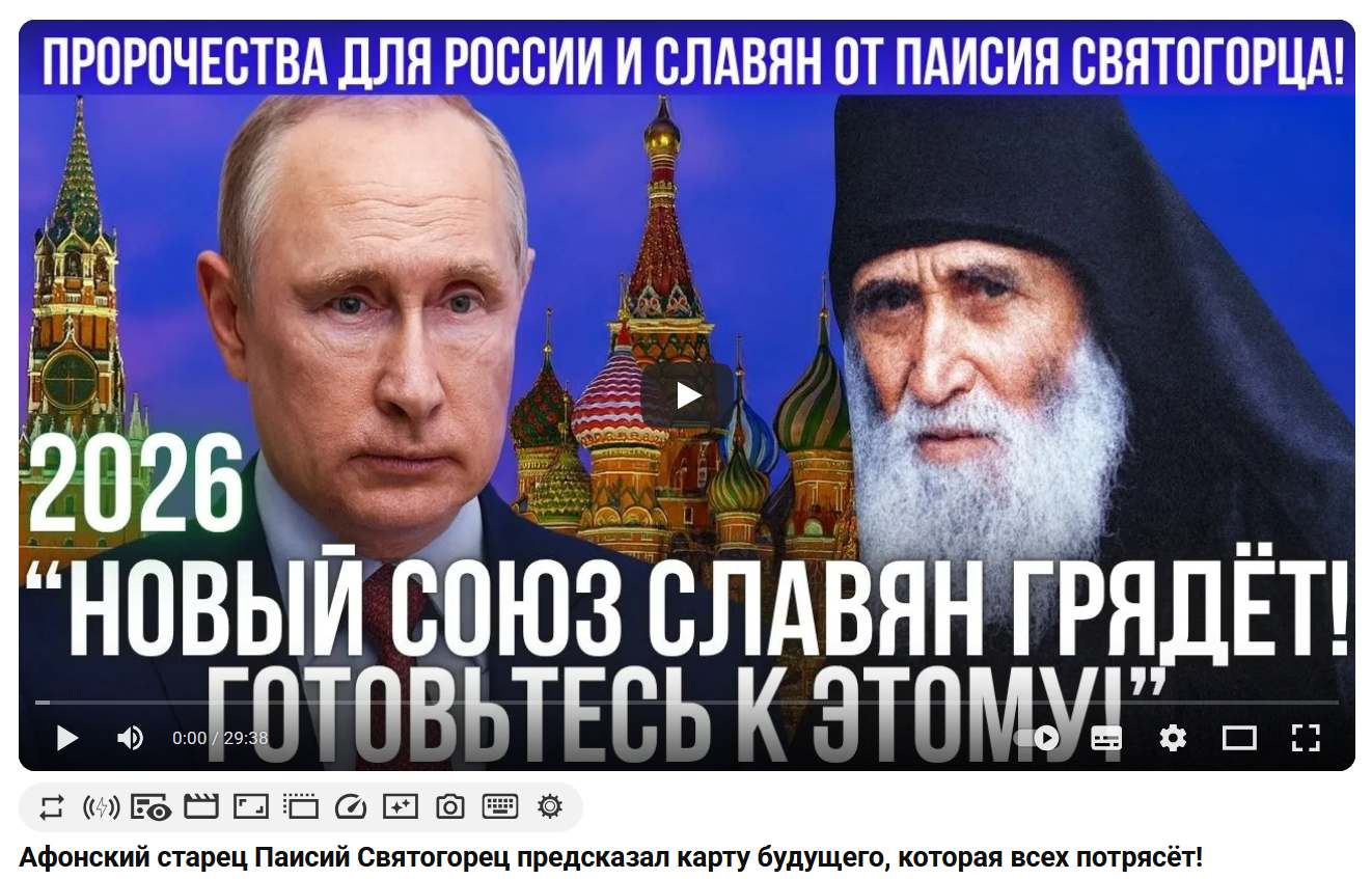 Objevil se videopořad, který má evidentně posloužit architektům "ruského světa", a to metodami, které jsou vetknuty do základů této ideologie: manipulací, lží, převracením faktů a propagandou vnucující naivním lidem báji o všeslovanské, Ruskem vedené, říši spravedlnosti, dobra a zbožnosti. Video údajně vysvětluje současnou geopolitickou situaci ve světle výroků starce Paisije. Nějaké sbírky výroků sv. Pasije jsem v minulosti četl, ale mnohé z toho, co říká komentátor ve videu, jsem nepoznával a duch sdělení, který z tohoto videa vane, se mi zdá zcela neslučitelným s tím, co Pasij hlásal a učil. Jedním z příznaků mysli osvícené blahodatí Ducha Svatého je totiž dar střízlivosti. A právě touto střízlivostí se vyznačují všechna autentická poučení starce sv. Paisia Svatohorce.